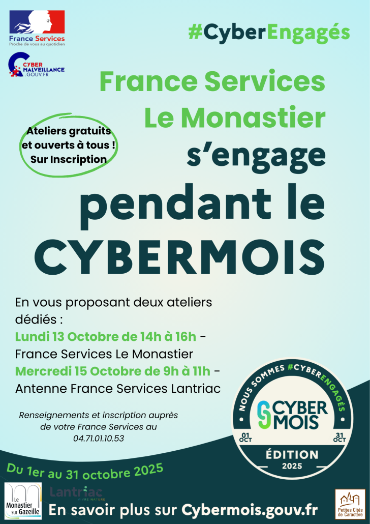 A l’occasion des portes ouvertes de votre structure France Services Le Monastier et du CyberMois édition 2025, votre agence vous propose de participer à un atelier – jeu visant à sensibiliser aux bonnes pratiques en ligne, à repérer les situations dangereuses (tentatives d’hameçonnage, de piratage, …) et à adopter les bons comportements pour sécuriser vos données.