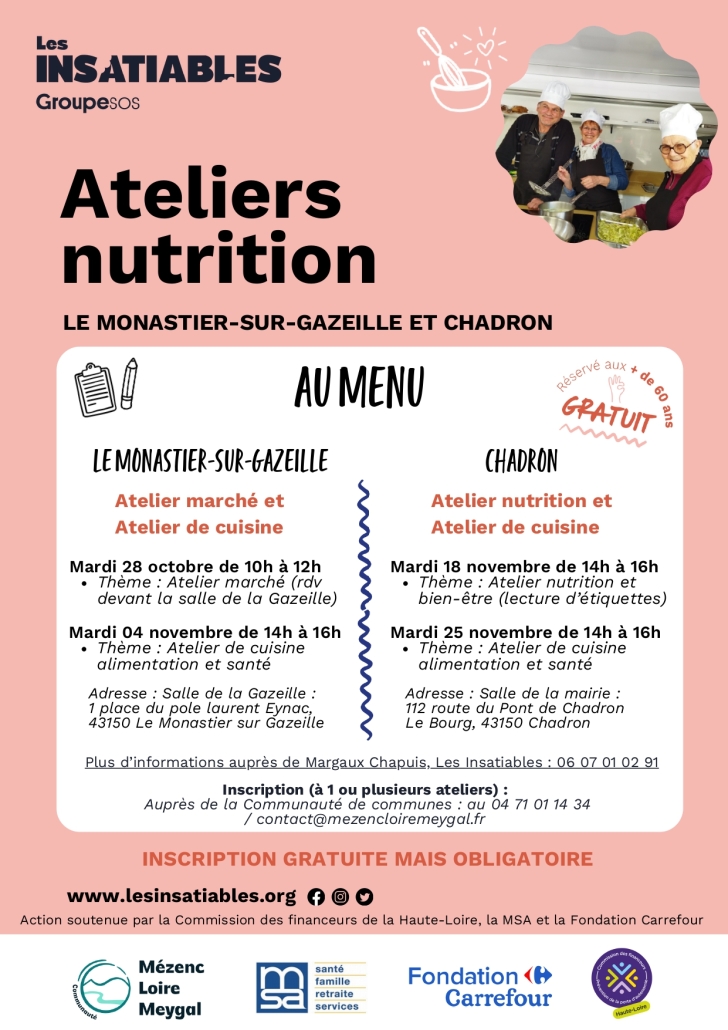 La CommunautĂ© de Communes MEZENC LOIRE MEYGAL et son partenaire Les Insatiables proposent une sĂ©rie dâateliers nutrition sur le territoire, spĂ©cialement dĂ©diĂ©s aux personnes de plus de 60 ans.