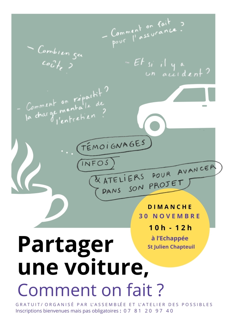 Dimanche 30 Novembre, L’Atelier des Possibles et l’Assemblée (St Julien Chapteuil), vous invitent à un moment convivial autour du sujet de l’autopartage.