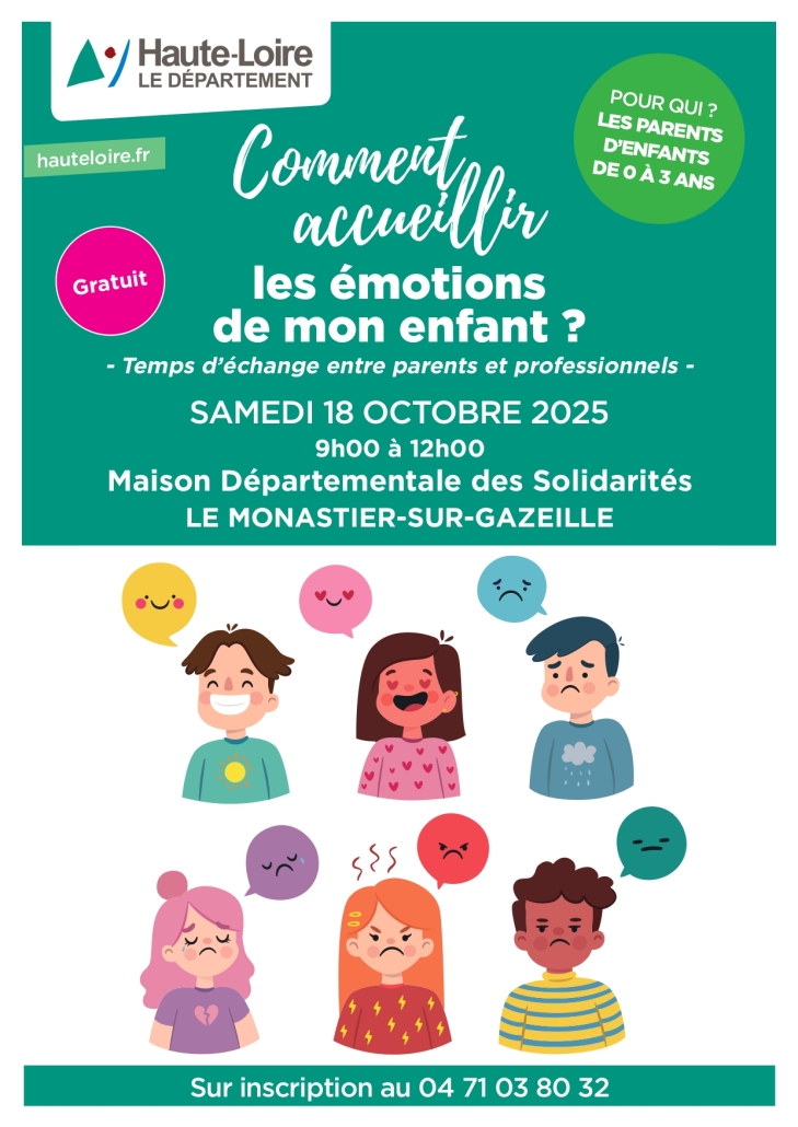 « Comment accueillir les émotions de mon enfant ? » Temps d’échange dédié entre parents et professionnels destiné aux parents d’enfants de 0 à 3 ans. Rendez-vous samedi 18 Octobre entre 9h et 12h à la Maison Départementale des Solidarités du Monastier (1 Place du Pôle Laurent Eynac) Rencontre gratuite sur inscription.