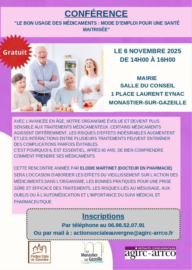 Jeudi 6 Novembre 2025, le CCAS du Monastier, en collaboration avec l’organisme de complémentaire retraite Agric-Arrco, vous invite à venir assister à la conférence « Le bon usage des médicaments : mode d’emploi pour une santé maîtrisée »