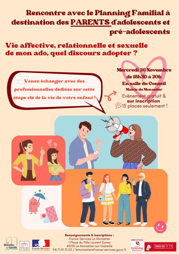 Mercredi 26 Novembre, France Services Le Monastier invite les PARENTS d’adolescents et pré-adolescents à venir participer à un temps d’échange avec les professionnelsdu Planning Familial 43.