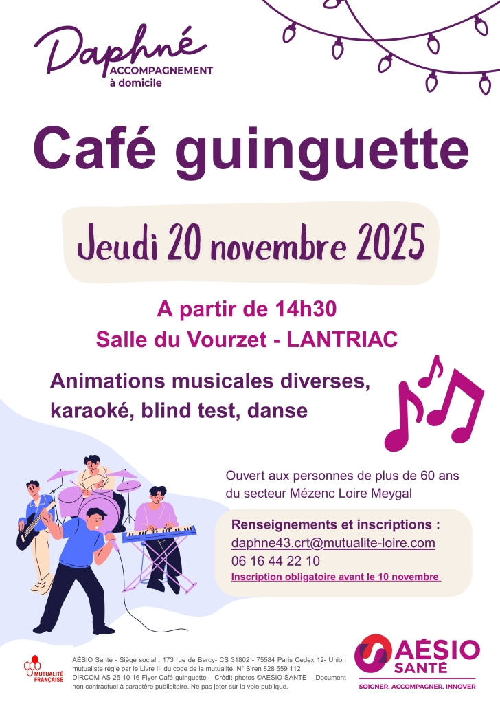 Après-midi café guinguette, organisé par l’organisme Daphné, jeudi 20 Novembre à 14h30 à la salle du Vourzet à Lantriac. Evènement ouvert à toute personne de 60 ans et plus du secteur Mézenc Loire Meygal – venez nombreux ! Renseignements et inscription auprès au 06.14.44.22.10 (⚠ inscriptions avant le 10 Novembre)