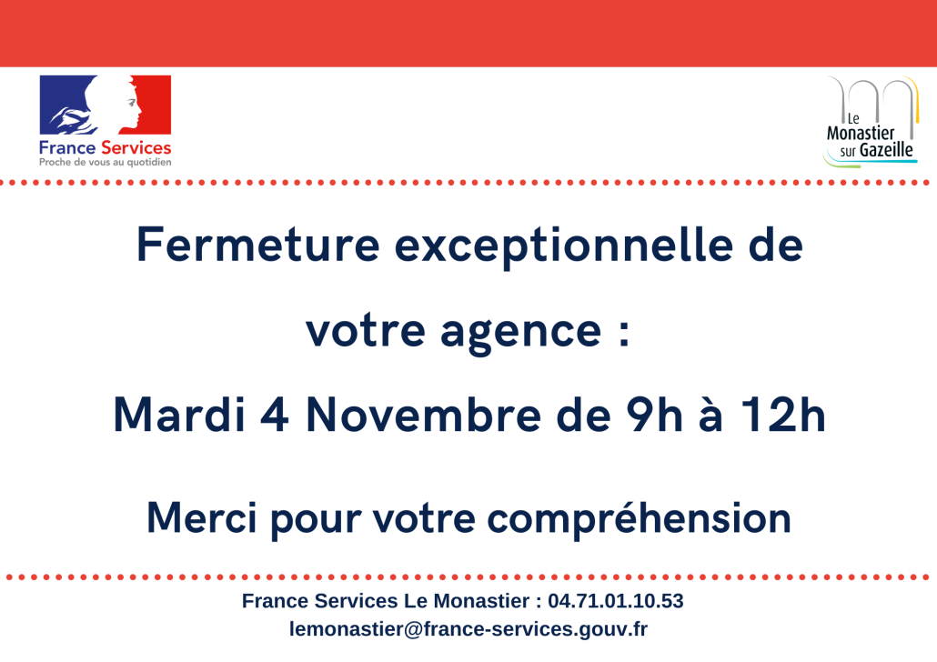 https://lemonastiersurgazeille.fr/wp-content/uploads/2018/04/Le-Monastier-Logo.png00Mairie du Monastierhttps://lemonastiersurgazeille.fr/wp-content/uploads/2018/04/Le-Monastier-Logo.pngMairie du Monastier2025-10-28 17:01:172025-10-28 17:01:22Fermeture exceptionnelle France Services – Mardi 4 Novembre