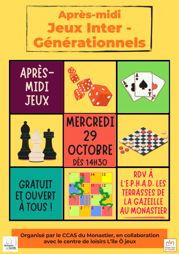 Après-midi jeux intergénérationnels, mercredi 29 Octobre. Rendez-vous dès 14h30 à l’E.H.P.A.D. Les Terrasses de la Gazeille au Monastier pour partager un temps convivial ! Evènement gratuit et ouvert à tous, organisé par le CCAS du Monastier, en collaboration avec le centre de loisirs L’île Ô jeux. Venez nombreux 😀 !