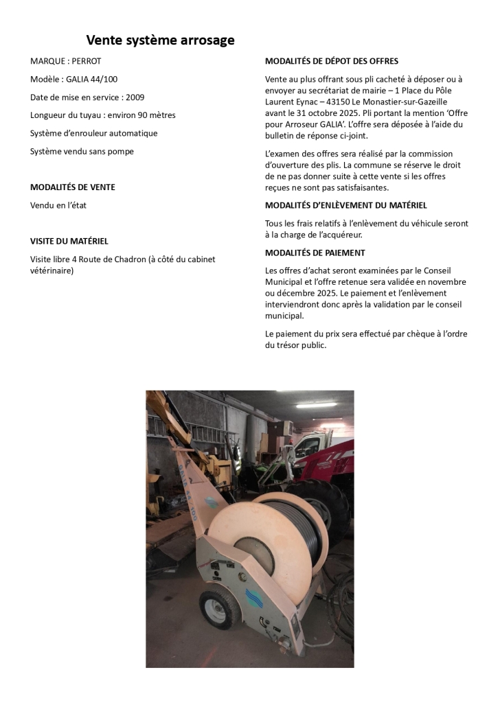 La commune du Monastier propose à la vente l’ancienne épareuse des services techniques de la commune (marque ROUSSEAU) ainsi que l’ancien système d’arrosage du stade (marque PERROT).