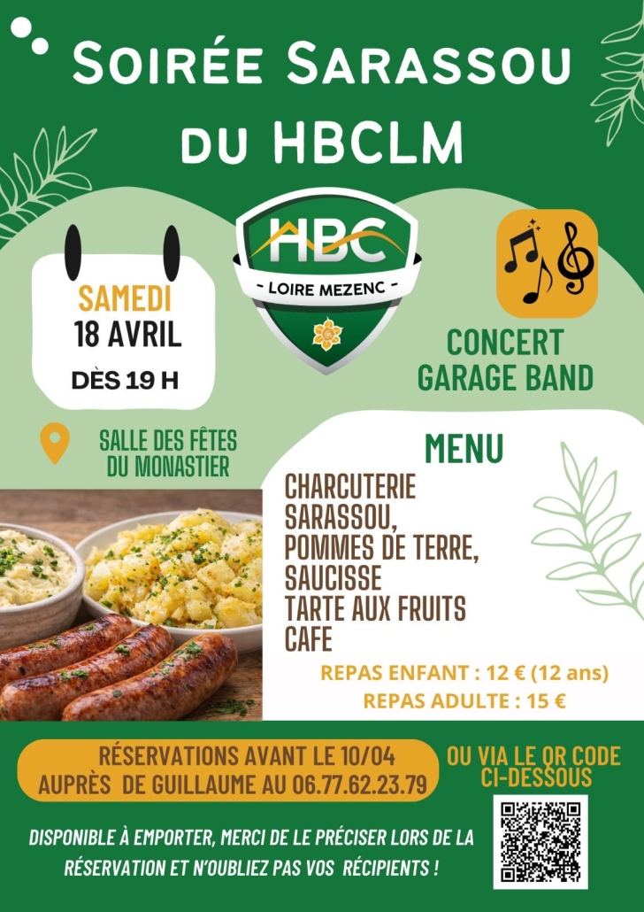 Soirée Sarassou avec le Handball Club Loire Mézenc le samedi 18 avril à partir de 19h, à la salle des fêtes du Monastier ! Concert et restauration sur place Pensez à réserver avant le 10 avril 🙂