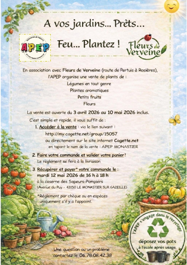 En partenariat avec Fleurs de Verveine, l’APEP organise une vente de plants de : Légumes en tout genre, plantes aromatiques, petits fruits, fleurs Commande en ligne du 3 avril au 10 mai 2026 inclus Récupération et paiement le mardi 12 mai 2026 de 16h à 18h Voir les modalités sur le flyer 🌱
