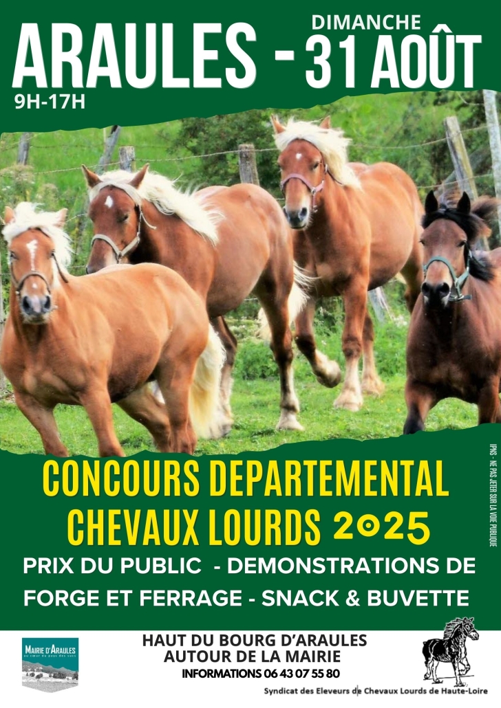 « 🐴🐴 CONCOURS DEPARTEMENTAL 2025 DES CHEVAUX LOURDS🏆SELECTION de HAUTE LOIRE 🏅🏅🏅 aura lieu le 31 AOUT à ARAULES (à 10 minutes d’Yssingeaux). une 40ène d’éleveurs, avec une 60ène de juments et leur poulain éliront domicile sur Araules (autour de la maire et la place devant la laiterie) toute la journée : présentation des juments à partir de 9h – jusqu’à 16h – remise des prix à 17h. 🏆 Prix du public 🏆 : VENEZ CHOISIR votre jument coup de ♥ parmi les premières de chaque catégorie et remettre le PRIX DU PUBLIC d’ARAULES! Snack – boisson 🥤🍿 et démonstration de forge et ferrage toute la journée. »