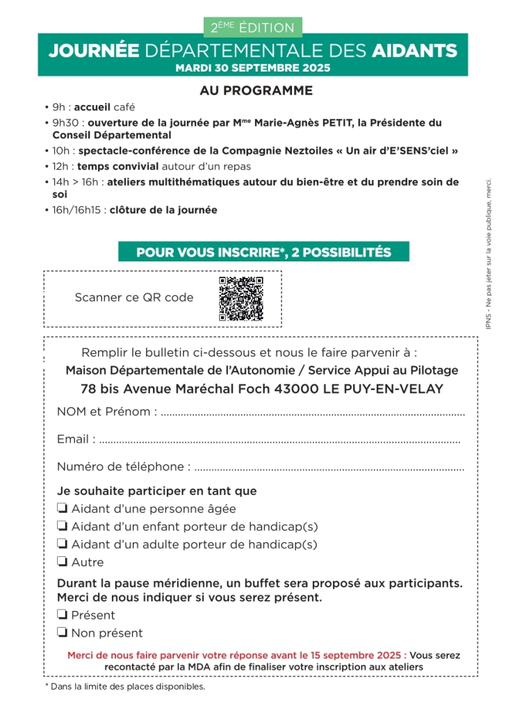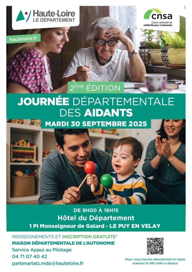 Le Département de la Haute-Loire vous convie à la 2ème édition de la Journée Départementale des Aidants, un événement essentiel dédié à la reconnaissance et au soutien des aidants auprès des personnes âgées ou des personnes en situation de handicap (enfant ou adulte) de notre département.