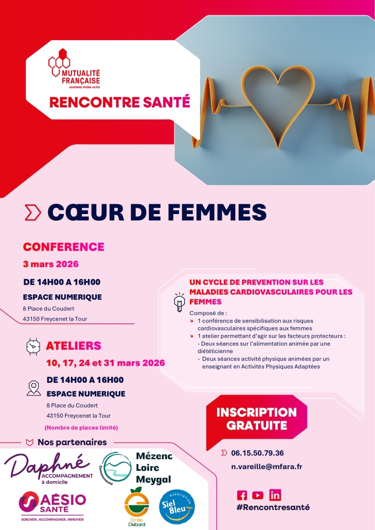 Parce que les maladies cardiovasculaires touchent aussi les femmes, nous vous proposons un temps fort dédié à la prévention, à l’information et aux gestes pour prendre soin de votre cœur.