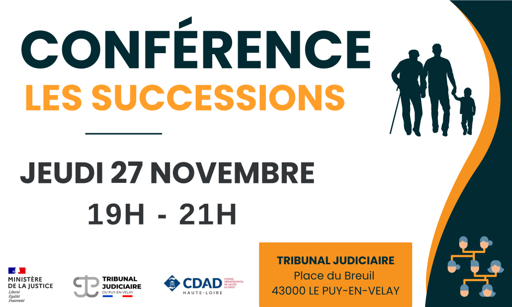 Le cycle de conférence : les Rencontres du Tribunal Judiciaire se poursuit avec une nouvelle conférence : jeudi 27 Novembre 2025 de 19h à 21h au Tribunal judiciaire du Puy-en-Velay (place du Breuil) et qui portera sur la thématique suivante : « Les successions »