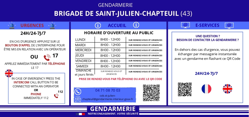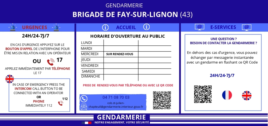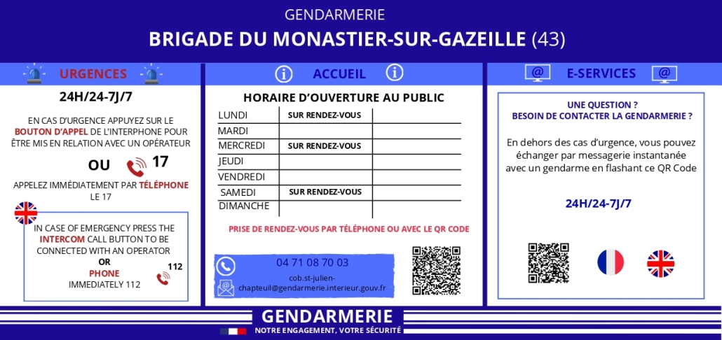 Les modalités d’accueil des brigades de gendarmerie de notre secteur (Le Monastier-sur-Gazeille, Saint Julien-Chapteuil, Fay-sur-Lignon) évoluent à compter du 1er Janvier 2026.