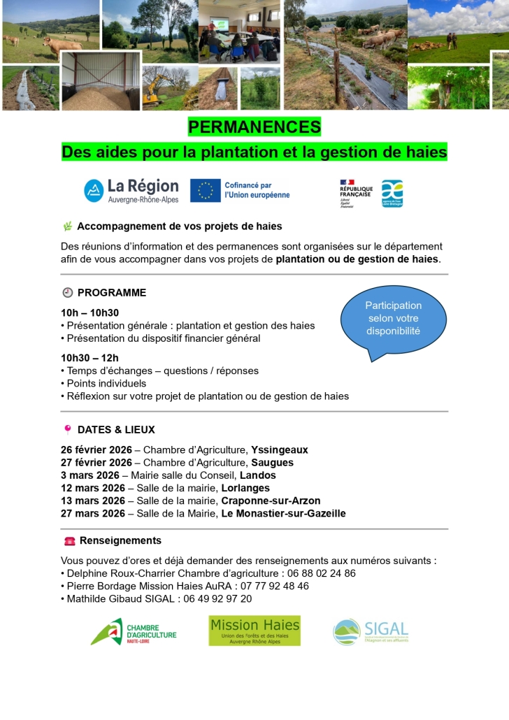 Du 26 Février au 27 Mars 2026, des permanences seront organisées sur tout le territoire de la Haute-Loire pour aborder les sujets de la plantation et de la gestion des haires.