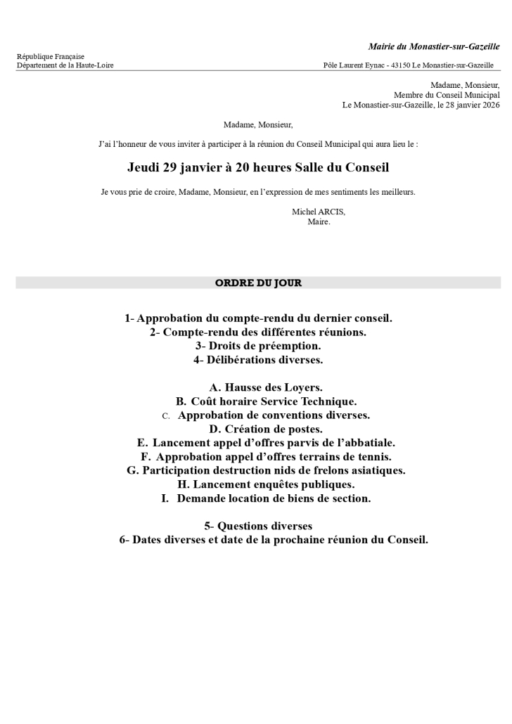Vous êtes ici : Accueil1 / Actualités2 / Informations3 / Prochain Conseil Municipal – Jeudi 29 Janvier 2026